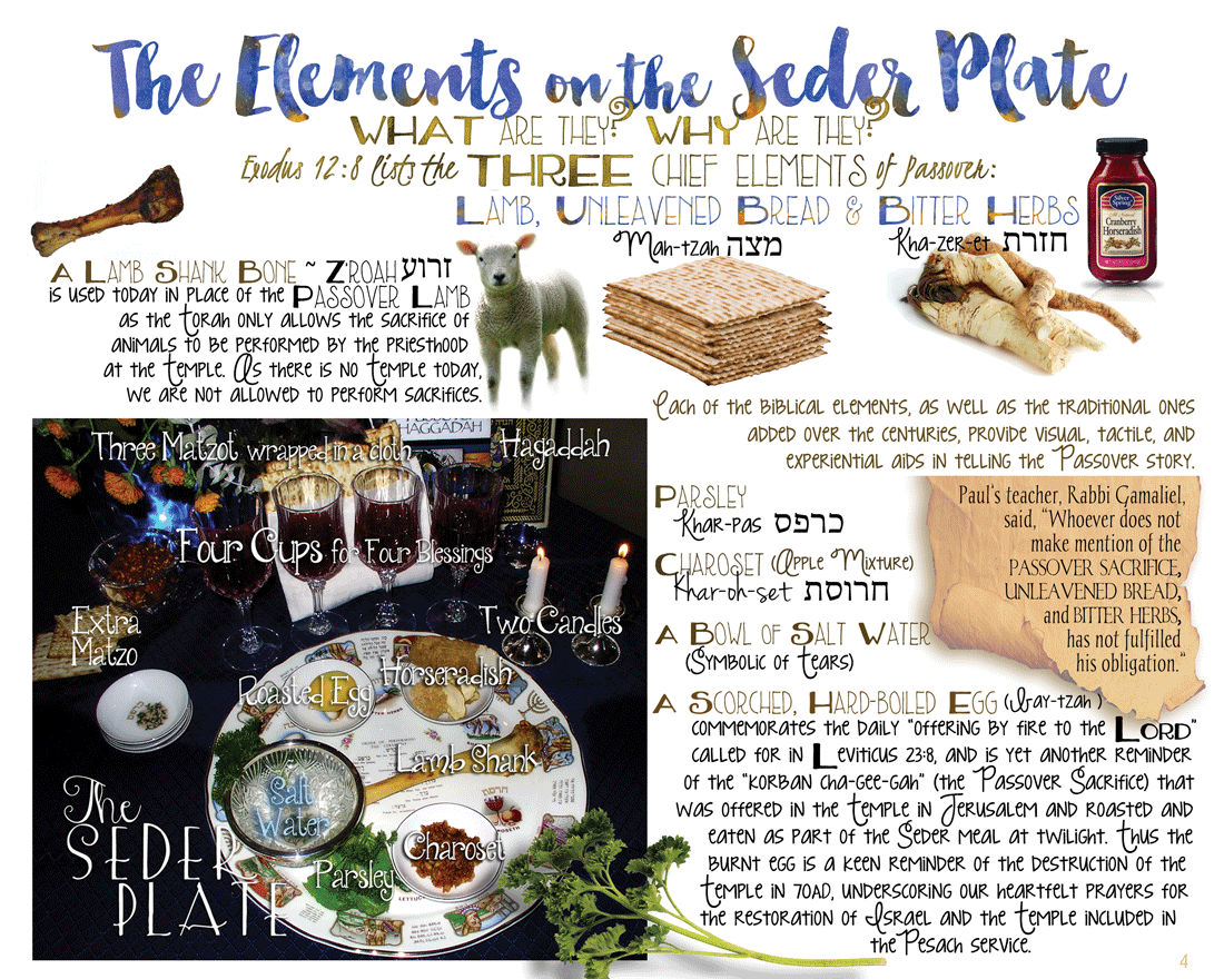 The traditional Passover Meal consists of fifteen steps and specific elements. Each is partaken in order, accompanied with blessings, narrative, and biblical passages to accomplish "the telling" ~ the imparting of the story of God's miracles, faithfulness, and lovingkindness in the Exodus story, from generation to generation.